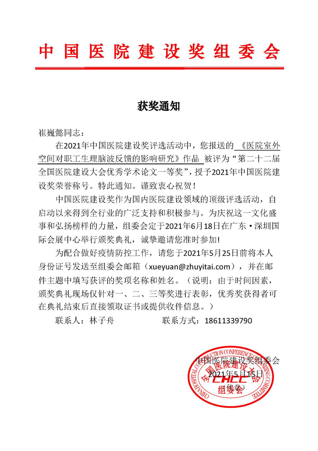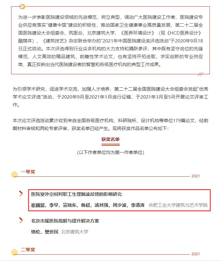 近日,“第二十二届全国医院建设大会优秀学术论文”评选结果揭晓,公司选送的论文《医院室外空间对职工生理脑波反馈的影响研究》(崔巍懿、李早,宣晓东,鲁超,汤其强,周少波,李清涛)经前期材料审核和两轮专家评审,从179篇参赛论文中脱颖而出,斩获一等奖。该论文第一作者、公司可持续建筑工程二级学科博士点(由m88官网和土木与水利工程公司联合培养)博士生崔巍懿被授予“2021年中国医院建设奖”,并受邀参加6月18日在深圳举行的颁奖典礼。