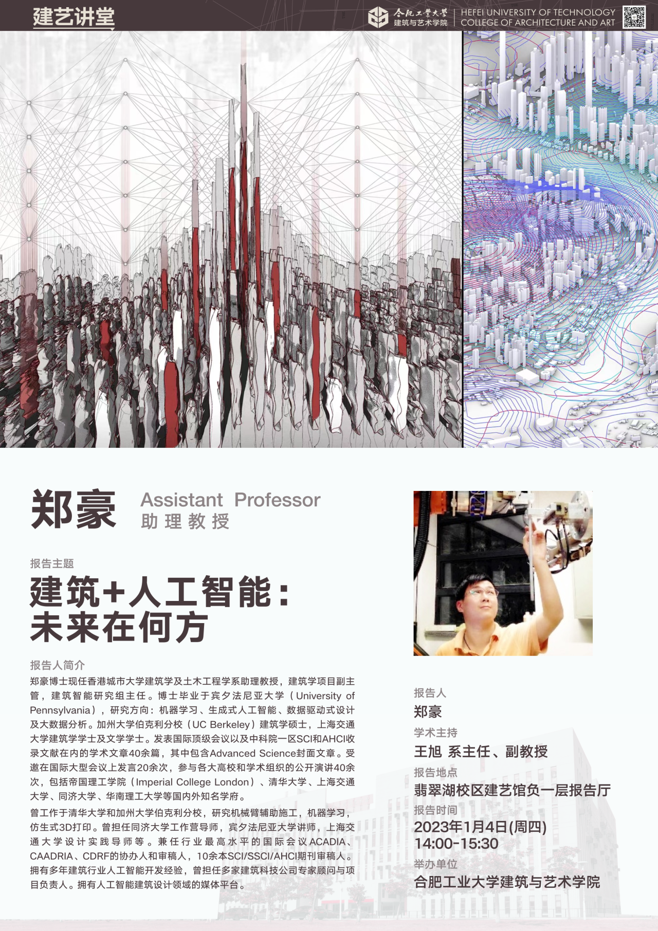 郑豪博士现任香港城市大学建筑学及土木工程学系助理教授,建筑学项目副主管,建筑智能研究组主任。博士毕业于宾夕法尼亚大学(University of Pennsylvania),研究方向:机器学习,生成式人工智能,数据驱动式设计及大数据分析。加州大学伯克利分校(UC Berkeley)建筑学硕士,上海交通大学建筑学学士及文学学士。发表国际顶级会议以及中科院一区SCI和AHCI收录文献在内的学术文章40余篇,其中包含Advanced Science封面文章。受邀在国际大型会议上发言20余次,参与各大高校和学术组织的公开演讲40余次,包括帝国理工公司(Imperial College London)、清华大学、上海交通大学、同济大学、华南理工大学等国内外知名学府。