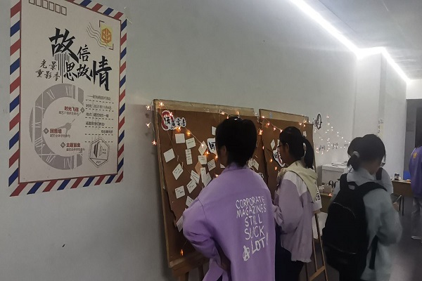 活动由“时光飞信”“回音墙”与“主题盲盒”三个部分组成。在“时光飞信”活动中,同学们在明信片上写下给一年后自己的一段话,表达对自己未来的勉励与期许,将其装入信封,并于收信仪式亲手将信封投入信箱,寄出信件。信件将于一年后寄还给各位收信人。