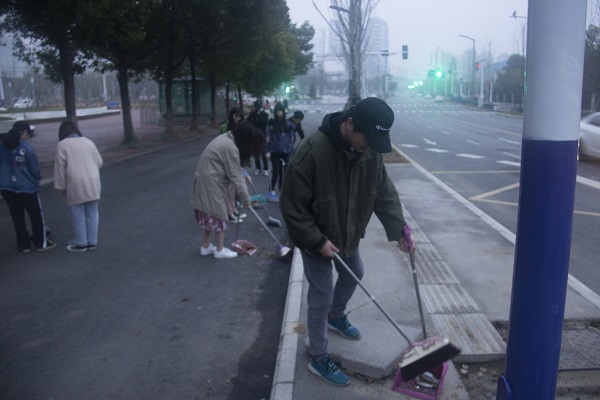 在劳动节期间,志愿者们凌晨就起床对校园内外的街道进行清洁打扫,体验劳动者的艰辛与不易,同时也为环境保护作出自己应有的贡献。