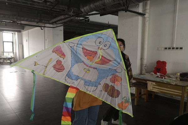 活动成员被分成若干小组,每组参赛人员围着风筝坐成一圈,用颜料绘出风采,用画笔诠释青春。同学们根据自己喜欢的素材,并结合心理健康相关元素,设计风筝的图案,从创意的构想到图形的确定,各小组经过了一次又一次的筛选。绘画过程中,同学们奇思妙想、创意无限,在灵动的手指下,一个个卡通人物、风景画纷纷完成。偶尔也会有几个小组互相参观,给对方提出意见,整个操场上充满了画笔的涂抹声和低声的讨论声。