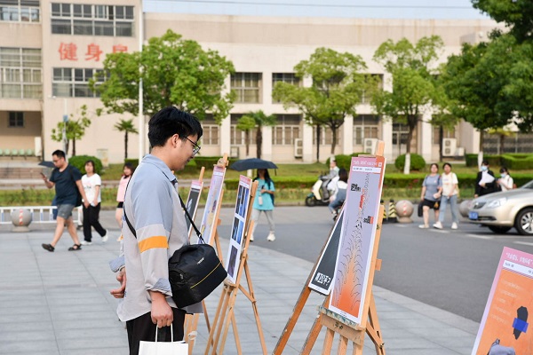 5月25日,“逆境携行 你我同晴”心理健康公益广告大赛优秀作品展览在翡翠湖校区一食堂门口举行。同学们纷纷驻足观看,为优秀心理健康广告作品点赞。