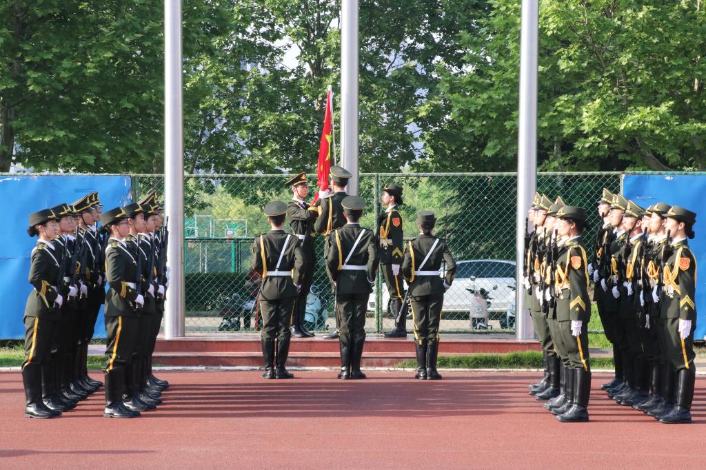 迎着朝阳,英姿飒爽的国旗护卫队护送着五星红旗,迈着铿锵的步伐走上升旗台。伴随着《义勇军进行曲》激昂的旋律,五星红旗冉冉升起、迎风飘扬。全体师生庄严肃立,向国旗行注目礼,用雄壮的国歌声抒发着爱党爱国爱校情怀。