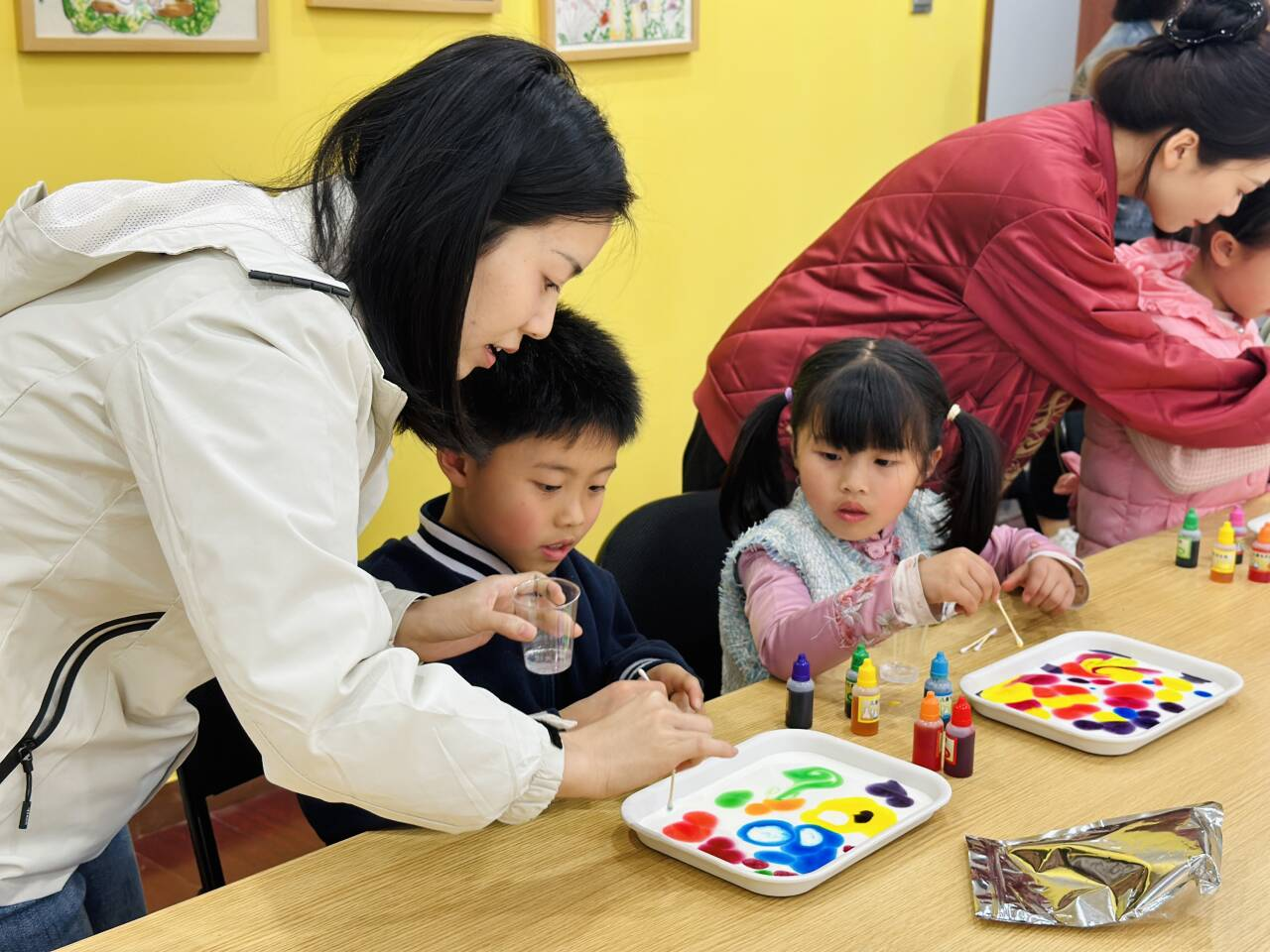 本次活动围绕“科艺交相辉映——科学小实验:跳舞的牛奶”主题展开。志愿者们带领学员们一起学习“牛奶跳舞”科学实验的相关知识,包括牛奶表面的张力、乳化和化学反应等。随后,志愿者们为学员们分发科学实验材料。在志愿者们的讲解和指导下,一朵朵由学员们的创造力所催生的鲜艳“花朵”绽放舞动。本次活动不仅让小朋友们体验了动手的乐趣,也让他们收获了艺术创作的成就感。