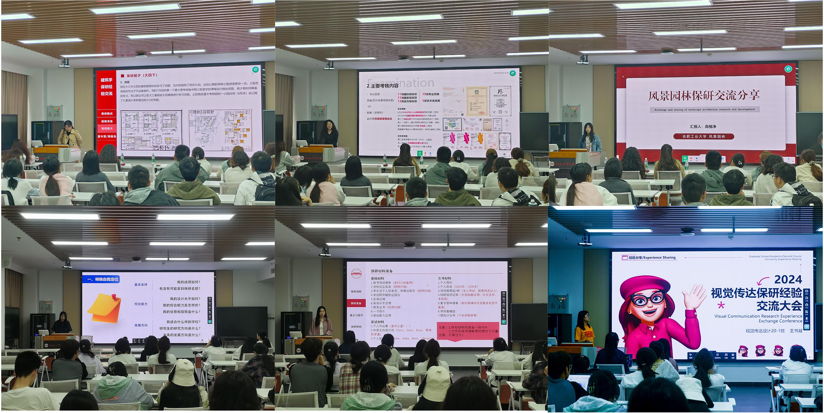 首先,学长学姐们分别从前期准备工作、保研复习内容、时间安排、保研流程和保研方式等方面向大家进行了详尽的介绍,同时每个人又结合各自的经历讲述了自己的心得体会。来自建筑学专业的王芷宁,保研至厦门大学,她详细的介绍了保研的优势和资格条件。来自城乡规划专业的秦齐,保研至东南大学,她为广大学子清晰地罗列了在保研中的几个重要时间节点,帮助大家更好地把握时间。来自风景园林专业的高桠净,保研至重庆大学,她结合个人情况介绍了在保研过程中的一些信息盲区,为广大学子指明方向。来自工业设计专业的刘璇,保研至北京理工大学,她介绍了公司推免政策细则和资料准备的注意事项。来自环境设计专业的崔馨月,保研至苏州大学,她强调了在保研路上心态的重要性;来自视觉传达设计专业的王书凝,保研至江南大学,她认为在夏令营中海投的重要性,同时也希望广大学子们根据自己的实际情况在海投中找到自己心仪的高校,不留遗憾。