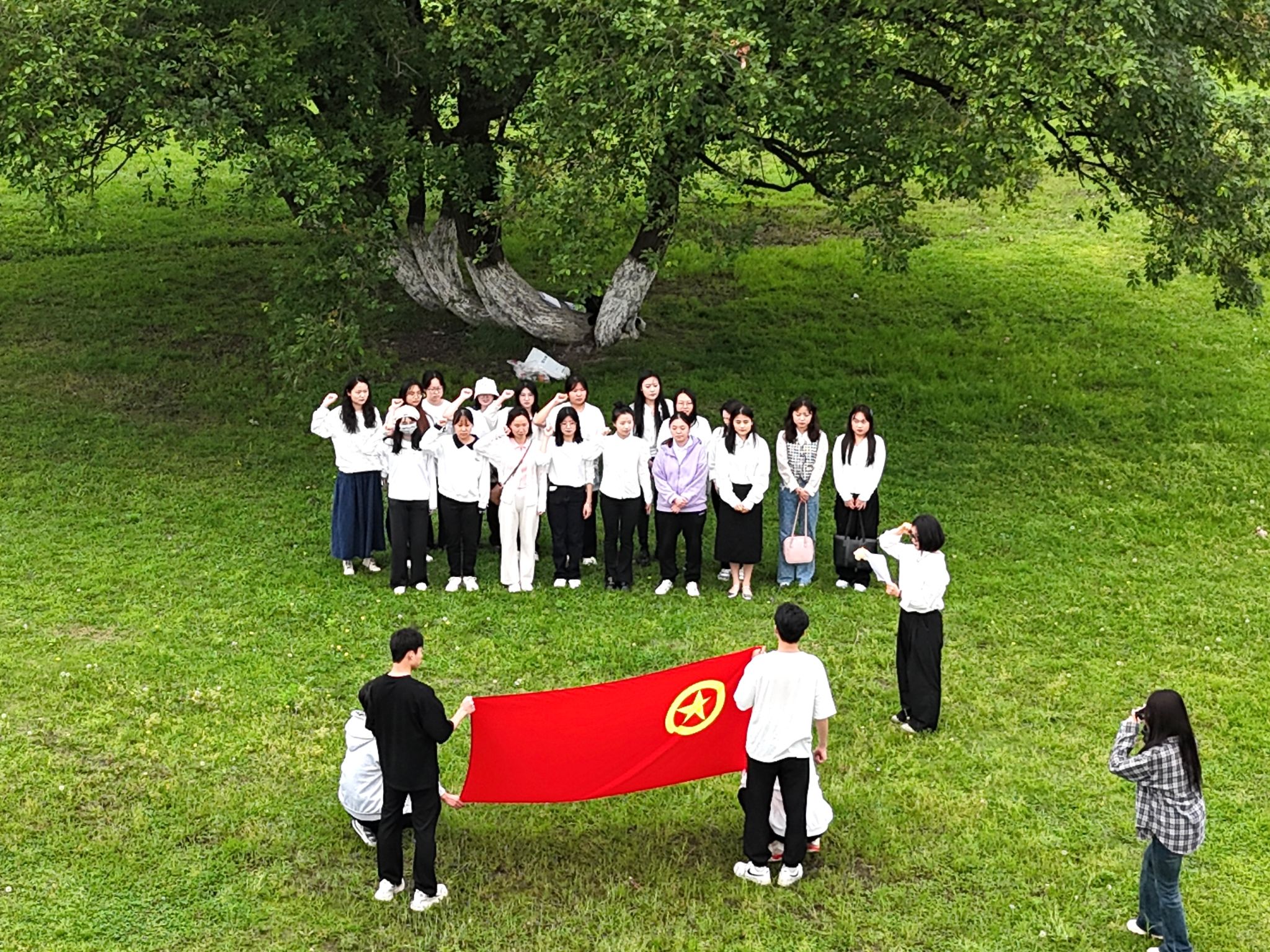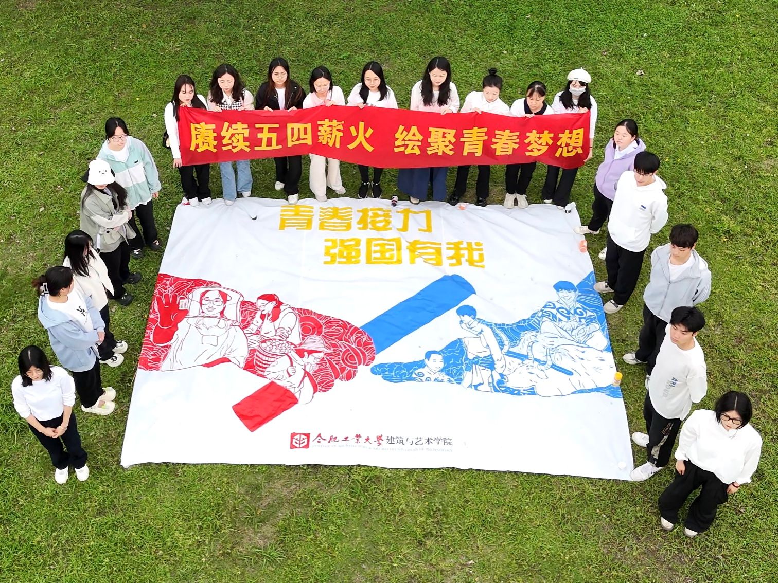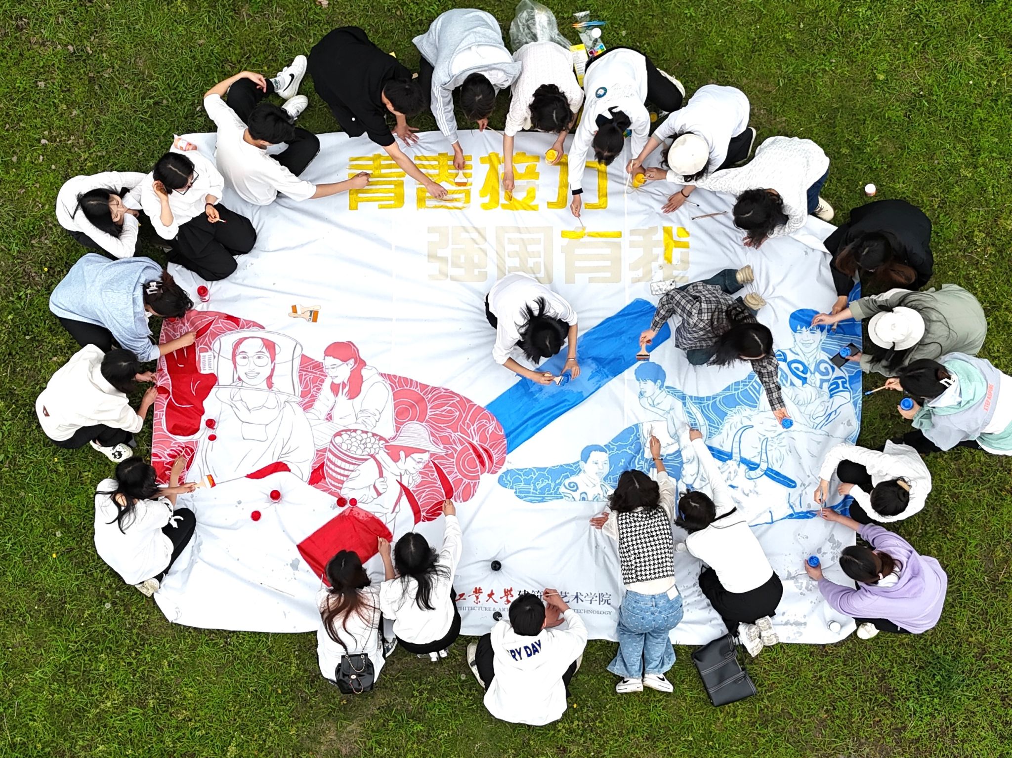 活动开始,青年们在团旗下集体重温了入团誓词。青年们提前设计绘画内容,将“青春”“奋斗”“强国”等元素融入到画卷中。在创作过程中,50多名青年相互协作、用线条唤醒最温暖的记忆,用绘画的方式传递正能量,共同完成了一幅极具意义的青春画卷。