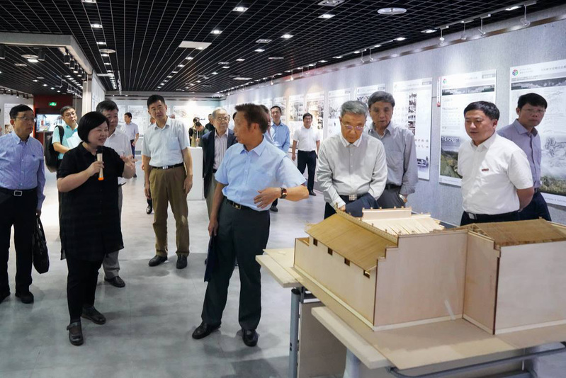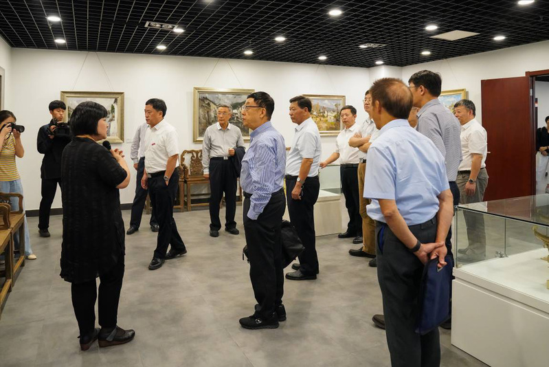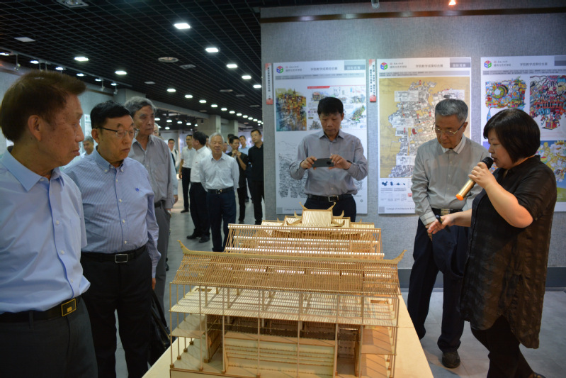 专家组一行首先来到公司艺术展厅考察公司教学成果展。经理李早向与会专家详细介绍了公司的发展历程、办学特色、教学体系、重点讲解了员工国际竞赛和境外交流获奖作品、文创设计作品、教师艺术创作成果、杰出员工等方面的情况,并向专家组展示了原创的获奖视频动画和自建模生成的线上情境展厅。随后专家组来到公司的徽派建筑文化展示中心,这里是公司“双一流”建设项目中文化创新方面的重要组成部分,是全国高校中极具特色的徽州文化专题性展示场馆,这里展出砖雕、木雕、石雕和古民居家具等展品以及公司教师的徽州系列油画作品。结合展览,李早进一步向专家组介绍了公司融合建筑人文与传统工艺、营造创新教学环境、促进学术研究、涵养美育教学等方面的建设成果。校领导和与会专家在徽文化展示中心中庭进行了座谈交流。