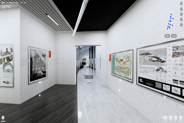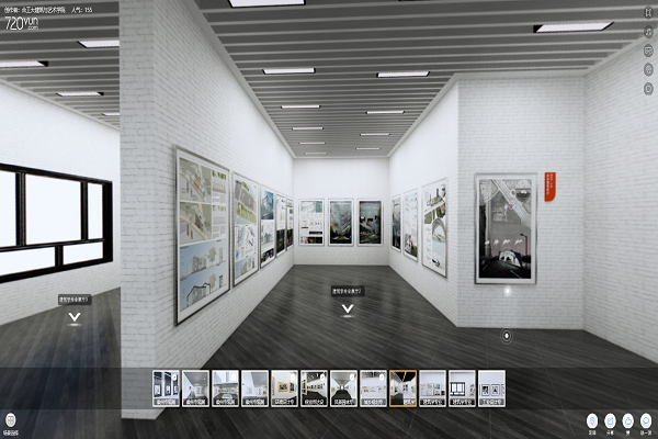 展厅基于设计类专业教学成果的图纸化、可视性,建立“虚拟漫游云展厅”,即在三维实景漫游系统基础上,原创自建模生成线上情境展厅。教学成果图纸、创作与设计方案贴图置于展厅内部,采用720微全景方式,可根据作品性质、效果、大小选择合适的展览位置,并可模拟参观者行走路线进行实景观看,点击感兴趣的作品还可以进行放大观赏。