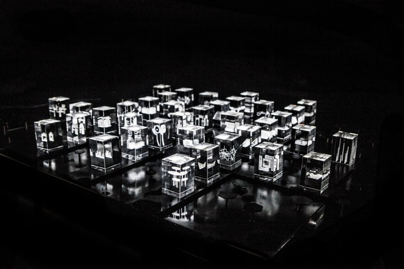 第三部分核心展品在展区中心展台,以城市设计所在地主要交通路网为轴线,通过激光打印,在37个水晶体块内内雕与其所处位置相关联的各类城市基础构成要素,以达到展示城市发展愿景的目的。