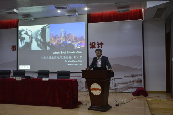 授聘仪式后,张铭做了主题为《当东方遇见西方:建筑的道、技、艺》的主题报告,与在场师生分享了他从业近三十年来的所思、所感、所做,受到大家热烈欢迎。