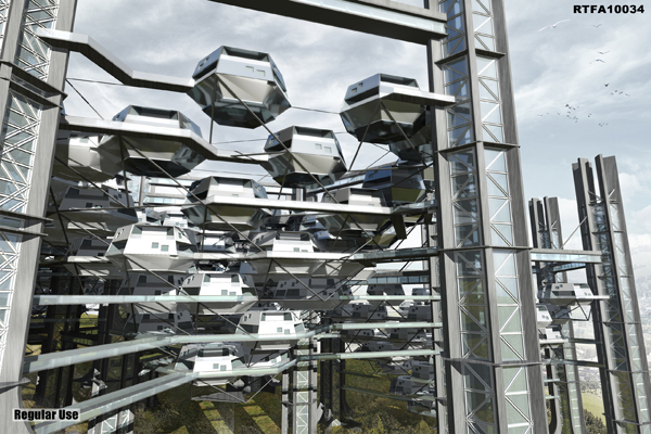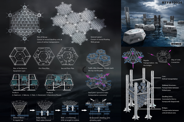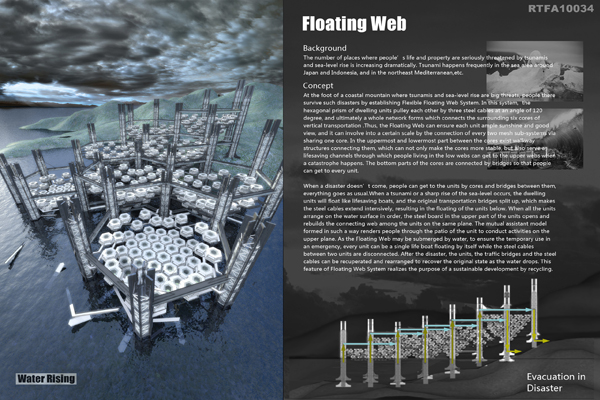 公司竞赛团队所提交的作品研究了严重威胁人类的海洋性灾害,针对世界越来越多的地方面临着海啸和海平面上升的问题以及人类的生存及财产受到的严重威胁,创造性地提出建筑解决方案。该方案通过建立浮网活性体系,抵御海啸或是海平面上升等自然灾害。浮网活性体系是由六棱柱住户单体通过滑轮与互成120度的三根钢索拉结,再与其他单体相连,最终整个“网”与周围六根核心筒相连,而形成的形似蜂窝状的倒锥形网状体系。这样的体系也保证了每个住户单体的日照及视野,并且每两个网状体系通过共用一个核心筒进行聚集形成一定规模。灾害未发生时,人通过核心筒及核心筒间的桥抵达住宅单体,正常使用;海啸来临或海平面上升幅度大,水位上涨时,单体住宅通过住宅设备层的排水量模拟救生艇模式上浮,原交通桥解体,钢索拉紧,使得原来下方的住宅逐渐依次上浮,并沿水面排成一个平面,住户单体顶部开启的钢板形成互相连通的交通路径,使位于同一平面的住宅单体彼此联系,构成互助单元,并且使人能够通过住户单体的中庭上到住户顶部的平面进行活动;当灾害特别严重,海啸的破坏力巨大时,海水淹没了浮网活性体系,为了保证住宅的临时使用,即使单体间的钢索被迫解体,每个单体也可作为救生单体自行漂于海面,保证人们的生命安全。交通桥通过铰节点与核心筒进行柔性连接。当灾害来临时,交通桥解体,一端连接于核心筒,另一端则浸于水中。而待其结束后,水平面下降,交通桥、住户单体及钢索等部件可以进行修复与重组,恢复成海啸前一样的状态,从而达到循环使用、可持续发展的目的。