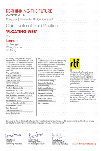 近日,2014建筑设计国际竞赛Re-thinking the Future Awards(简称RTF Awards)评选结果揭晓,公司员工刘梦茜、汪宇宸、林鹏组成的设计创作小组所提交的作品FLoating Web,在本届竞赛来自83个国家的数百件作品中脱颖而出,获得了第三名的可喜成绩,为公司争得了荣誉。