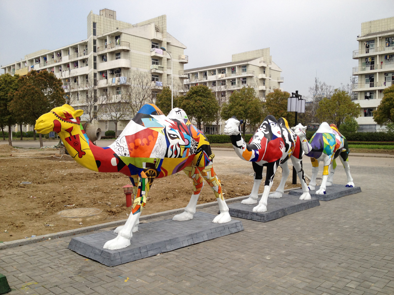 彩绘骆驼雕塑是放置于合肥1912商业文化创意街区的公共艺术作品。胡适当年曾把徽州人拼搏进取、忍辱负重、百折不挠、吃苦耐劳的创业精神比喻成“徽骆驼精神”。引用形象的符合寓意阐释 合肥1912商业时尚街区,实为别具新意的巧妙构思。这批彩绘骆驼是张扬的同时也是内敛的,是大众的但不落俗的,这靓丽的色彩,张扬是必然的。更难得的是它内敛了徽州这片土地千百年积攒的文化。这么看似简单的公共艺术作品并不抽象,是所有受众都能欣赏的,如毕加索、蒙德里安、解构主义、后现代装饰风格等众多艺术流派融入其中,可以说是简单中透露着奢华的艺术气息,观赏中给以美的享受。