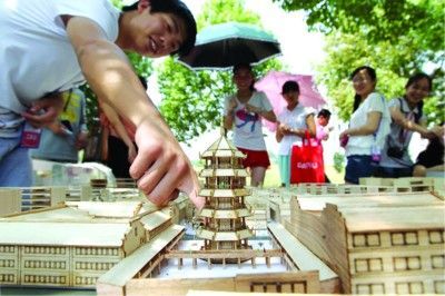 合工大建筑和艺术公司10级2班表现的城市主题是合肥。 “城隍庙承载了很多老合肥人的记忆,而且它即将迎来改造,应该用模型把它定格下来。 ”参与模型设计的方飞说起创意的初衷。记者简单数了下,模型中至少有65个单体,而且主建筑的栏杆、窗户、庙宇的屋檐、院落的青石板等相当精细、逼真,工作量非常大。“时间很紧,我们整整花了5天、熬了两个通宵才赶出来的。整个模型都是用质地坚硬的桐木片一点点拼接起来的。 ”