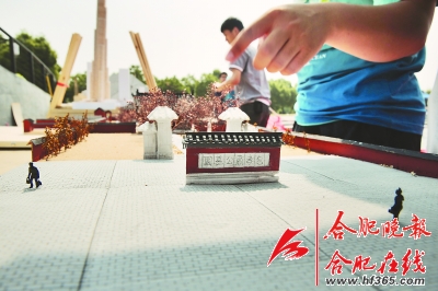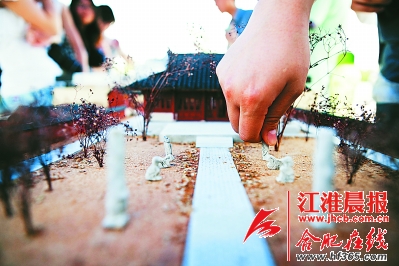 在众多作品中,有一个大家熟悉的建筑作品,那就是合肥包公墓的微缩版本。人像、神兽等雕塑虽然只有两厘米高度,但惟妙惟肖。“希望通过对于包公墓的展现表达对包公文化的尊重,希望所有游客都能爱护历史古迹。”包公墓模型制作者之一,合工大一名大二员工说。