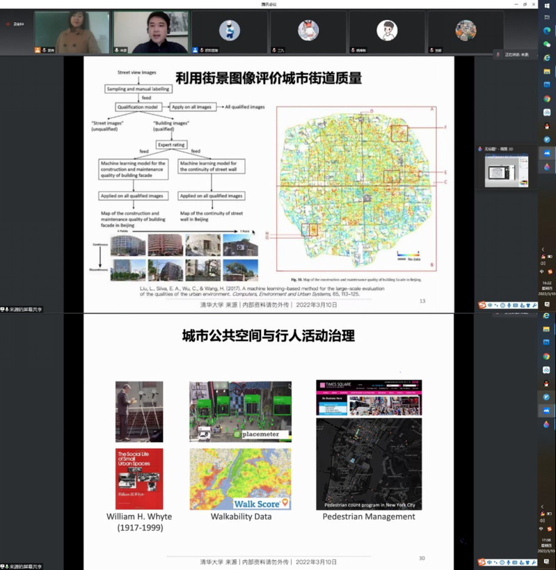 二十一世纪以来城市科技取得突破性进展,从数据信息、计算+模拟、技术应用等多维视角对城市信息进行融合,重新思考城市规划、城市设计、城市治理十分必要。为此,来源老师从三个方面对此展开具体介绍。首先就城市空间特性的客观测度、利用空间句法量化测度城市街道特征、利用街景图像评价城市街道质量、规划开发适宜性分析、基于真实数据的城市场所量化等方面内容展开了全景式介绍。接着对数据与计算结合城市设计思路、基于分析的城市设计框架、基于参数化的城市设计、基于模拟的城市设计方案评估、城市公共空间测量结合精细化城市设计、城市系统与基础设施智能化、公众参与与信息反馈的城市设计等前沿性主题进行系统性地总结分析与立体化教学展示。最后,来源老师结合自身在纽约开展的量化公共空间与场所、社交媒体舆情与社区变化这两个实践项目对融合多源数据的城市设计作进一步介绍。该专题讲座对同学们了解前沿性的空间分析技术方法、掌握全球数字时代的城市设计工具具有启发意义。同学们也积极向来源老师提问。