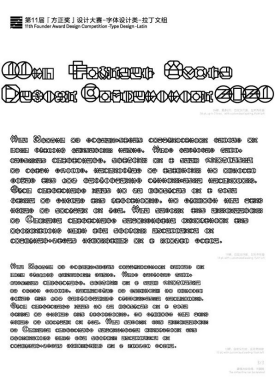 『方正奖』设计大赛是中国最早面向字体行业的设计类赛事,也是字体设计领域影响力最广、参加人数最多的专业赛事。2001年,在字体行业最艰难的时候,首届“北大方正奖”印刷字体设计大赛面向全社会征稿,此后每两年一届,至今已走过20年。『方正奖』见证了设计领域汉字热潮的兴起,也见证了字体行业20年来的发展壮大。通过『方正奖』大赛,许多优秀作品被开发成为字库,服务于大众生活;一大批优秀设计人才脱颖而出,有些作者已经成为行业中坚力量。在促进字体设计创新、发掘优秀设计人才的同时,加强了中西文化交流,推动了字体行业发展,为弘扬中华汉字文化起到了积极作用。