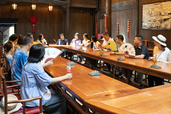 调研过程中,学员与宏村、呈坎镇政府相关人员开展座谈会,学员们就非遗保护与文化传承、乡村振兴、旅游文创产品开发等主题与当地领导和群众代表进行深入交流,积累了较为充足的访谈资料,为后续创作设计的选题和定位提供了可行性和落地性的支撑。