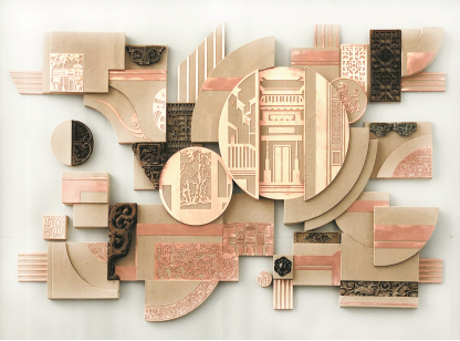 李学斌教授应邀为安徽省美术馆创作的壁画作品《徽风皖韵》则通过抽象、构成的艺术手法,挖掘徽州独特的元素符号,作品集徽派建筑、雕刻及传统纹样于一体,表现出徽州文化的深厚底蕴。