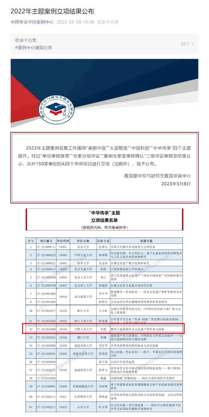 近日,在教育部学位与研究生教育发展中心(下简称教育部学位中心)开展的2022年主题案例征集工作中,m88官网宣蔚老师团队申报的“徽州古建筑保护及文化遗产的传承与创新”项目获批立项。