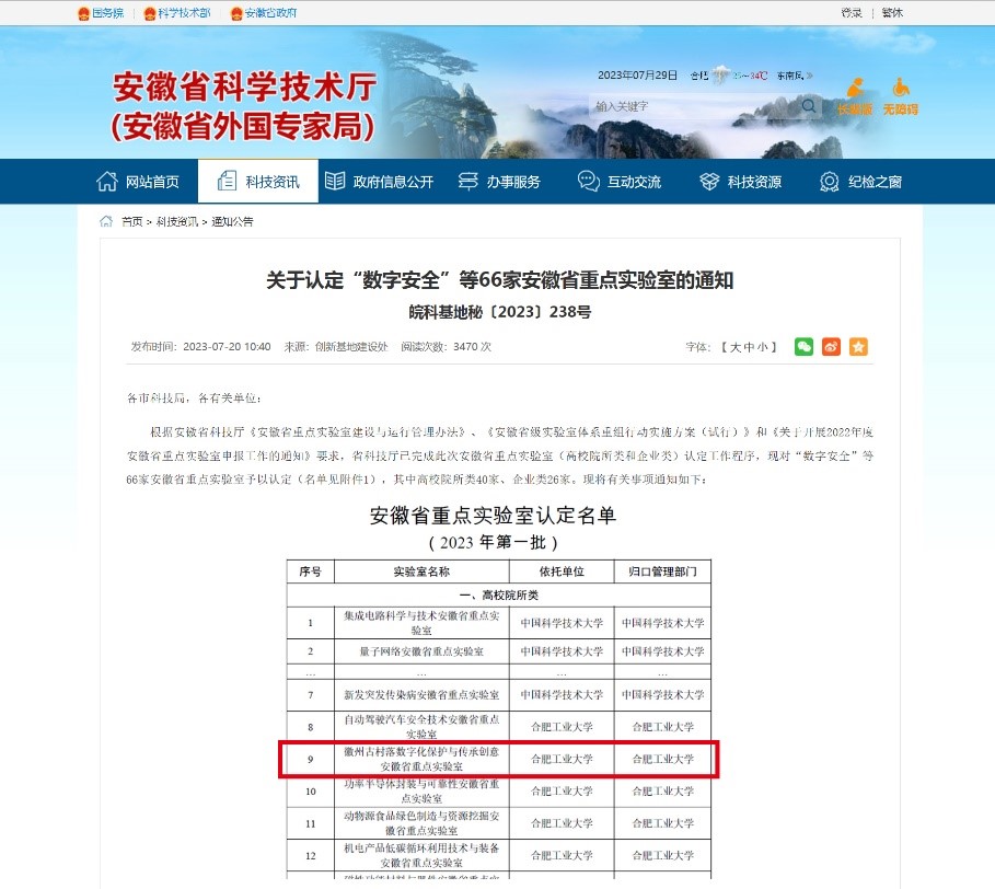 日前,安徽省科技厅发布了《关于认定“数字安全”等66家安徽省重点实验室的通知》(皖科基地秘〔2023〕238号),对40家高校院所类、26家企业类安徽省重点实验室予以最终认定。公司陈刚教授主持申报的“徽州古村落数字化保护与传承创意安徽省重点实验室”成功获批立项建设,这也是公司首次获批安徽省重点实验室。
