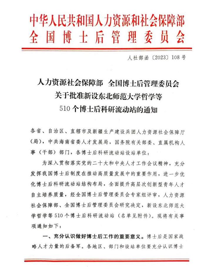 近日,人力资源和社会保障部、全国博士后管理委员会发布了《关于批准新设东北师范大学哲学等510个博士后科研流动站的通知》(人社部函〔2023〕108号),公司建筑学博士后科研流动站成功获批。这是公司建筑学学科继获得博士学位授权后,学科发展的又一标志性成果,是学科科研实力和学术声誉的重要体现。
