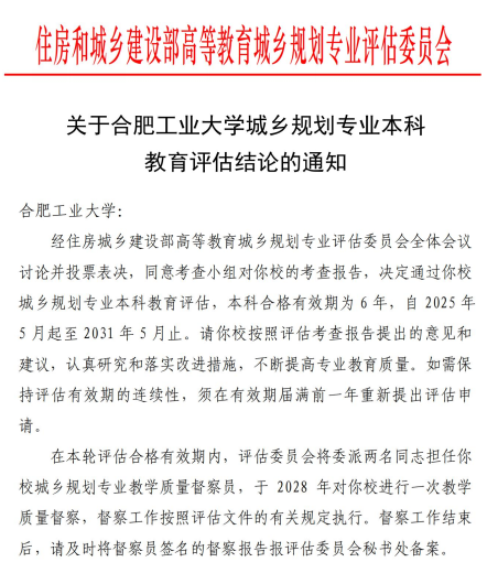 6月23日,公司城乡规划专业收到住房和城乡建设部高等教育城乡规划专业评估委员会文件《关于m88官方网站登录地址城乡规划专业本科教育评估结论的通知》并附《m88官方网站登录地址城乡规划专业评估考查报告》。公司城乡规划专业以最高等次通过城乡规划专业本科教育评估(本科合格有效期为6年)。