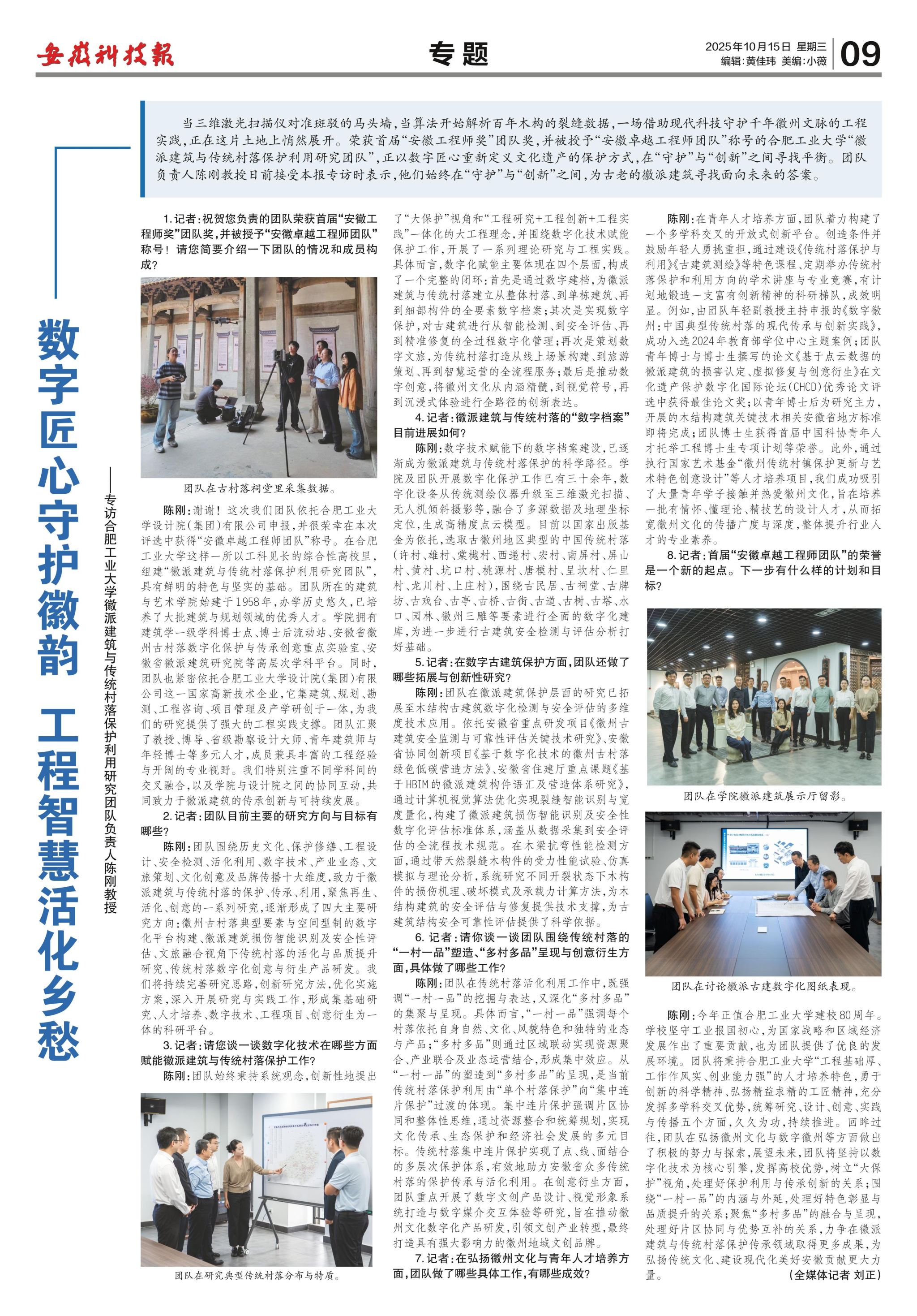 陈刚:谢谢!这次我们团队依托m88官方网站登录地址设计院(集团)有限公司申报,并很荣幸在本次评选中获得“安徽卓越工程师团队”称号。在m88官方网站登录地址这样一所以工科见长的综合性高校里,组建“徽派建筑与传统村落保护利用研究团队”,具有鲜明的特色与坚实的基础。团队所在的m88官网始建于1958年,办学历史悠久,已培养了大批建筑与规划领域的优秀人才。公司拥有建筑学一级学科博士点、博士后流动站、安徽省徽州古村落数字化保护与传承创意重点实验室、安徽省徽派建筑研究院等高层次学科平台。同时,团队也紧密依托m88官方网站登录地址设计院(集团)有限公司这一国家高新技术企业,它集建筑、规划、勘测、工程咨询、项目管理及产学研创于一体,为我们的研究提供了强大的工程实践支撑。团队汇聚了教授、博导、省级勘察设计大师、青年建筑师与年轻博士等多元人才,成员兼具丰富的工程经验与开阔的专业视野。我们特别注重不同学科间的交叉融合,以及公司与设计院之间的协同互动,共同致力于徽派建筑的传承创新与可持续发展。