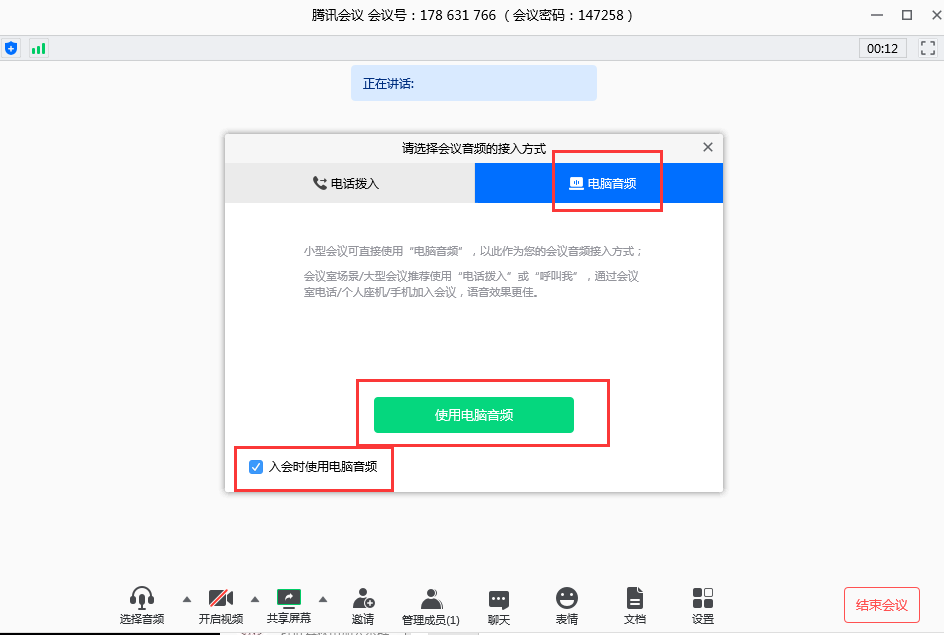 通知启用后,打开腾讯会议客户端点击加入会议,输入复试秘书提前告知的会议号,按照要求在两台设备上备注姓名+主/辅镜头,进入会议室后,选择“使用电脑音频加入”,进行身份查验,开展面试。