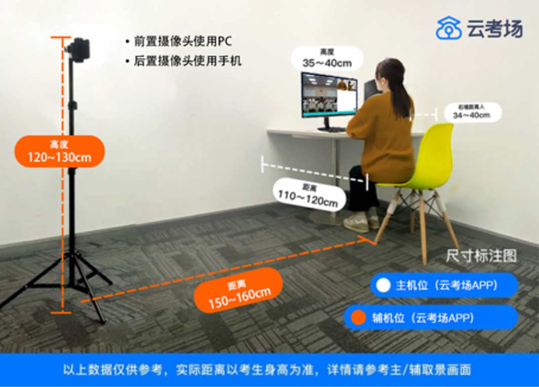 一台配有摄像头的电脑或一部内置摄像头的手机,摆放在考生侧后方1米左右,与考生屏幕成45度角,需全程清晰显示考生复试环境和主镜头屏幕;关闭副设备中的扬声器及麦克风,以防止产生噪音干扰;如使用手机,应把手机设置成静音状态;应确保电脑或手机电量充足。标准示例如下: