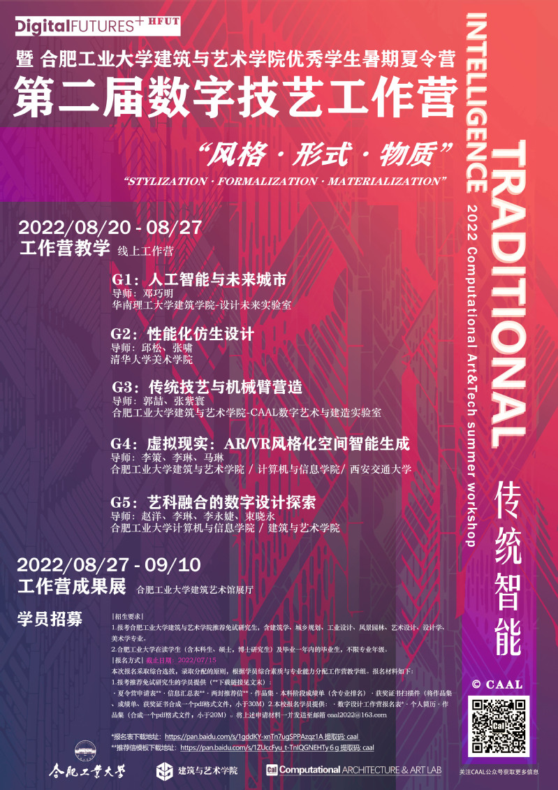 技术是为艺术创作的工具,艺术是为技术更迭的记载,从农耕文明至工业革命皆是如此。当代设计与建造将如何继承传统文化中的技艺与巧思,并在数字技术的加持之下迭代出全新的艺术形态?2022年暑假由m88官网CAAL(Computational Art&Architecture Lab)数字艺术与建造实验室联合DigitalFUTURES+计划发起第二届“数字技艺2022:传统智能”暑期校内工作营,集结活跃在国内数字化设计领域的科研团队、并邀请研究前沿的专家教授与青年学者共赴合肥与合工老员工一同进行为期7天的工作营教学与论坛活动,共同探讨在数字化技术的加持下,传统文化语境中建筑与艺术的全新表现形式与意义拓展潜力。