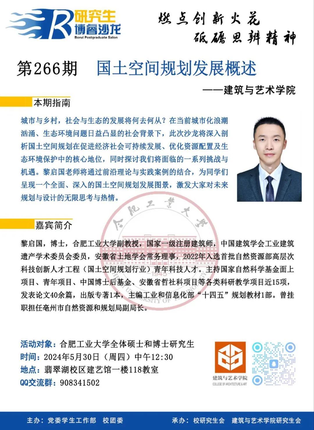 黎启国,博士,m88官方网站登录地址副教授,国家一级注册建筑师,中国建筑学会工业建筑遗产学术委员会委员,安徽省土地学会常务理事,2022年入选首批自然资源部高层次科技创新人才工程(国土空间规划行业)青年科技人才。主持国家自然科学基金面上项目、青年项目、中国博士后基金、安徽省哲社科项目等各类科研教学项目近15项,发表论文40余篇,出版专著1本,主编工业和信息化部“十四五”规划教材1部。曾挂职担任亳州市自然资源和规划局副局长。